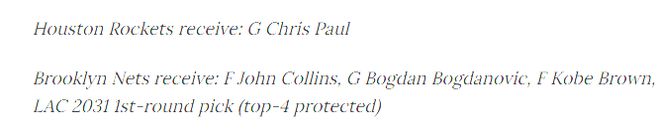 潜在交易方案:快船队获得迈克尔·波特二世,海伍德·海史密斯,杰肖恩·泰特;休斯顿火箭得到克里斯·保罗;篮网获得约翰·柯林斯,博格丹·博格达诺维奇,科比·布朗,以及洛杉矶城2031年首轮选秀权(前四保护)