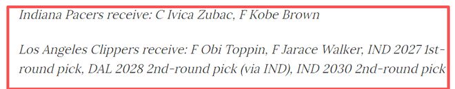 交易方案:步行者获得祖巴茨、科比·布朗;洛杉矶快船获得——奥比·托平、贾拉斯·沃克、2027年首轮选秀权、两个次轮签。