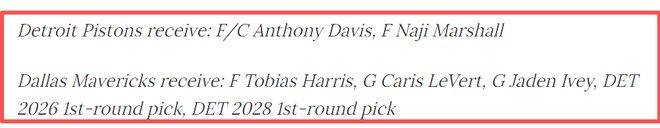 交易方案:活塞获得安东尼·戴维斯、纳吉·马歇尔;达拉斯独行侠获得——托比亚斯·哈里斯、卡里斯·勒维尔、贾登·艾维、2026年首轮选秀权、2028年首轮选秀权。